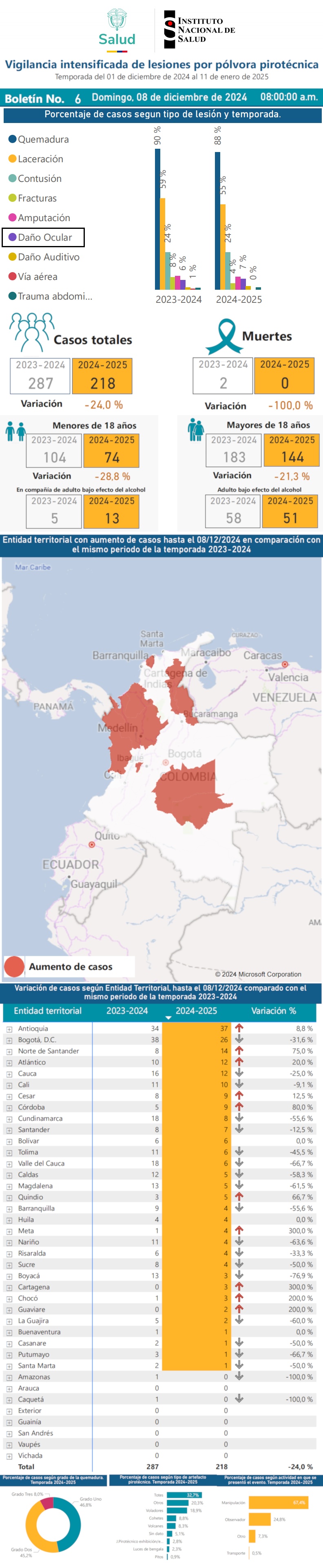 El Ministerio de Salud de Colombia y el Instituto Nacional de Salud - INS refuerzan medidas de prevención y vigilancia ante el aumento de lesiones por pólvora en la temporada de fin de año. Bogotá D.C., 2 de diciembre de 2024. En el marco de la temporada de vigilancia intensificada de lesiones por pólvora pirotécnico en el país, el Ministerio de Salud y Protección Social - Minsalud, de manera articulada con el Instituto Nacional de Salud - INS, expide una circular que establece las directrices para la vigilancia intensificada, prevención y atención de lesiones ocasionadas por pólvora pirotécnica e intoxicación por fósforo blanco, durante las fiestas de Navidad y Fin de Año.